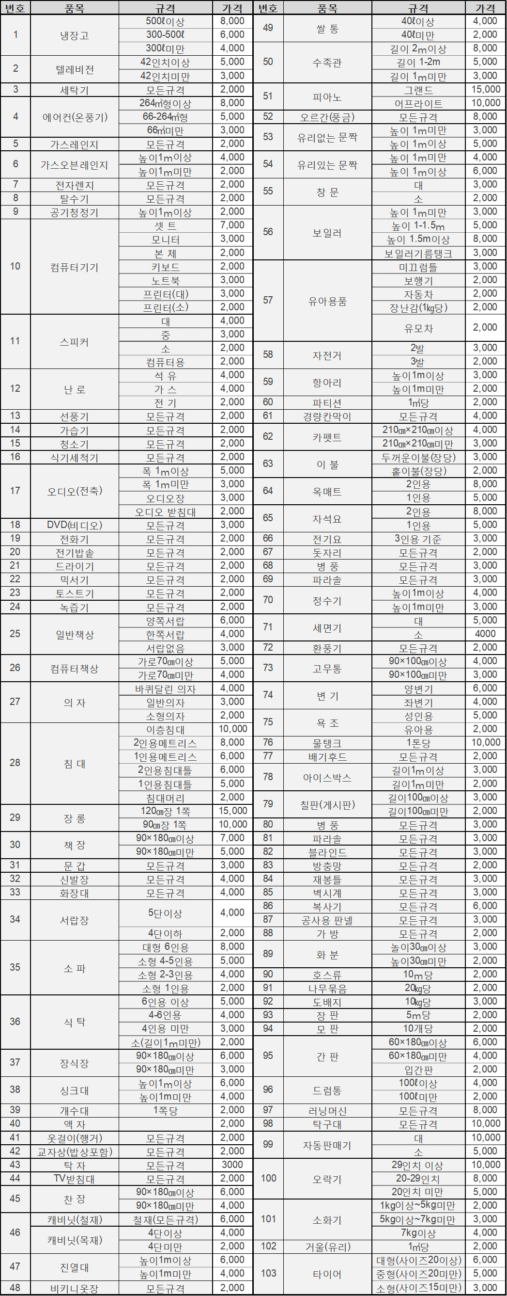 대형폐기물의 종류 및 수수료