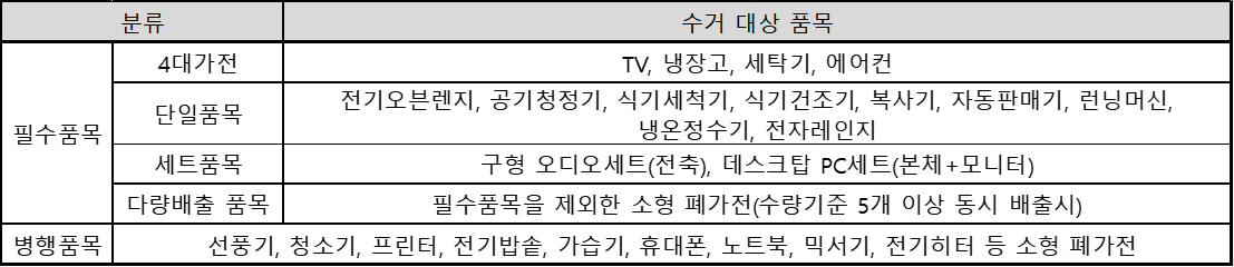 ※ 고장난 제품은 수거가능하나, 부품 탈취 등 원형훼손 제품(냉장고 냉각기, 세탁기 모터 등 부품 훼손)은 무상 수거가 되지 않습니다. 필수품목 배출시 병행품목(소형 폐가전) 무상수거도 가능합니다.